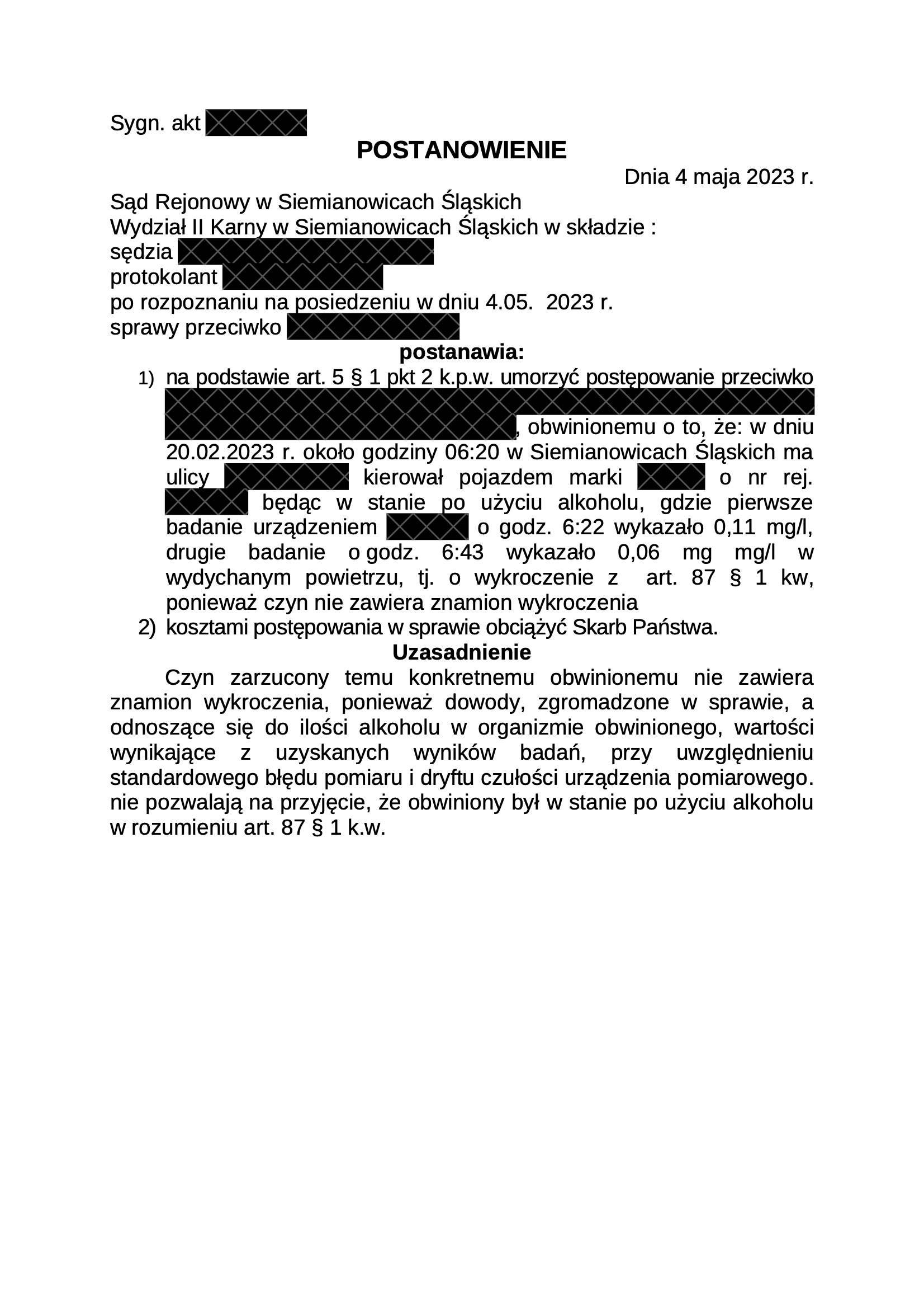 Poniżej przykład sprawy, w której dryft czułości doprowadził do umorzenia postępowania, wobec kierującego, który w chwili badania uzyskał wynika 0,11mg/l.